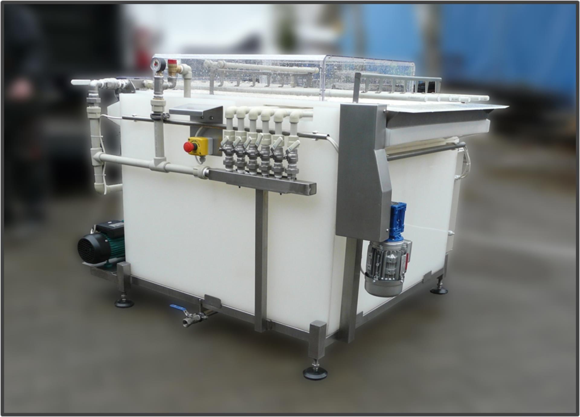 Urządzenie służy do przepłukania i wymycia butelek przed procesem napełniania powierzchni zewnętrznych i wewnętrznych. Mycie realizowane jest za pośrednictwem dysz ciśnieniowych współpracujących z wodą oraz detergentami.